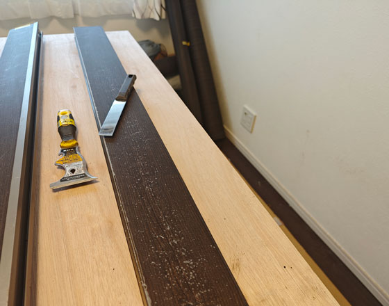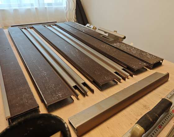 施工する前に新しい材料の手配をどんなものがいいかを相談して材料を発注します。貼り合わせるエントランスの門扉を外して、分解していきます。わからなくならないように、部品を管理しながら、パーツ掃除を掃除していきます。特に新しくシート貼る部分には、念入り掃除をこない、劣化したシート部分は、剥がして、ケレン後、平になるように下地を処理を行います。この作業自体が、全体の7割型重要になってきます。