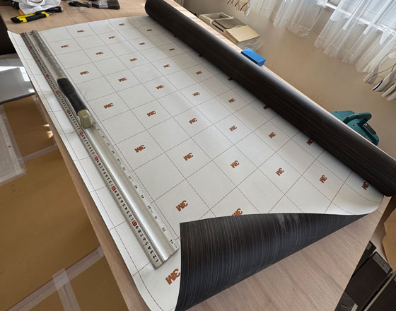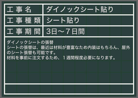 ダイノックシートを貼り替える場合は、貼り替えるものや大きさにもよりますが、おお旨、材料が手配出来しだい1週間程度で終わります。材料の手配が出来てから、貼り合わせる材料を分解して、掃除を行い、下地処理を行います。その後、部品ごとに材料を切り出してシート貼っていきます。最後は再度分解したパーツを組み立てて仕上がりとなります。