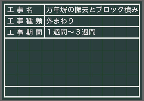 ブロック外構の修復工事などは、範囲にもよりますが、3日~1週間程度となります。